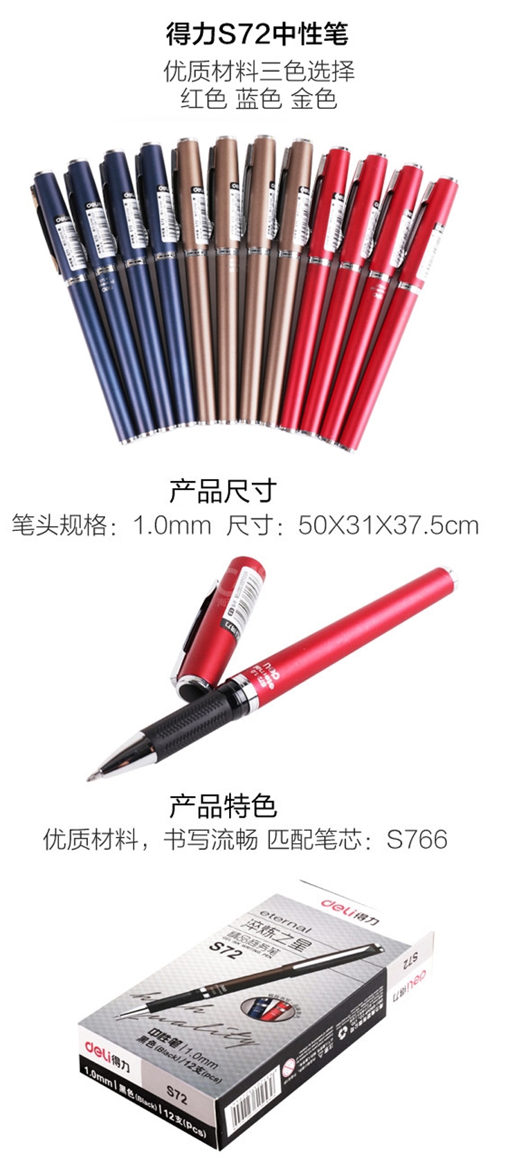 “deli/得力”S72 中性筆 單支裝(黑色1.0mm簽字碳素水筆辦公學(xué)習(xí)商務(wù)會議精品筆配套s766筆芯12支/盒)
