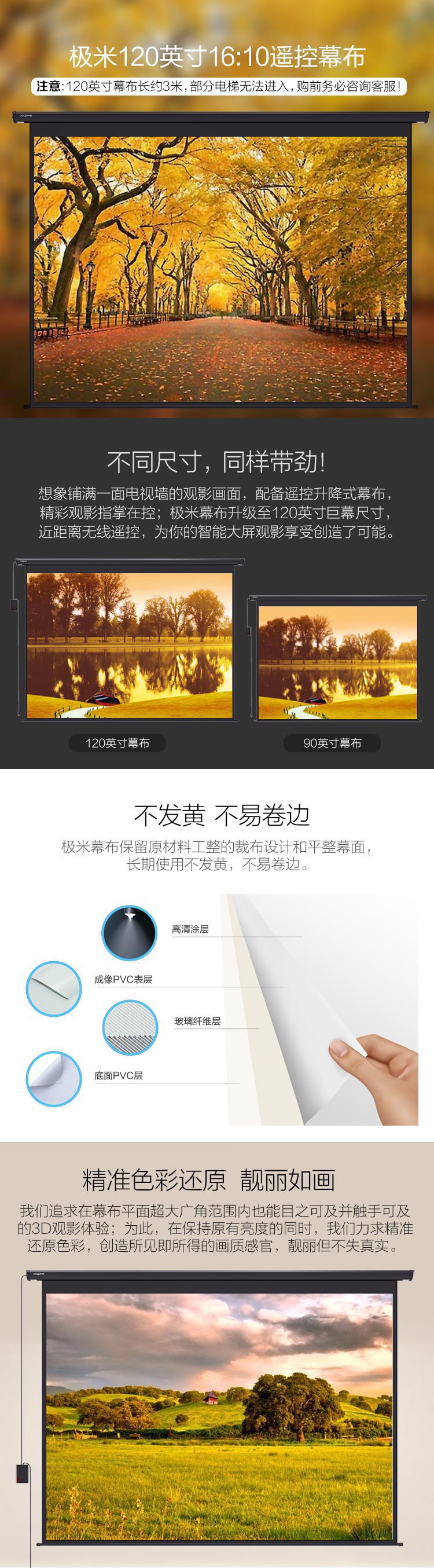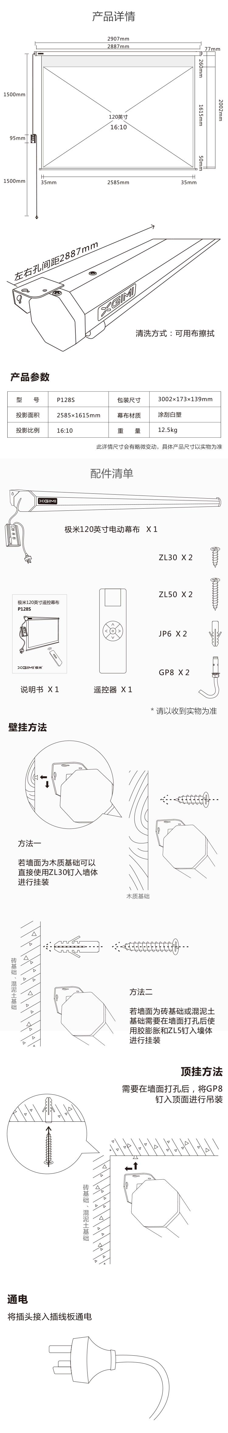 極米120英寸電動(dòng)幕布x1,說(shuō)明書x1,遙控器x1,ZL30螺絲釘x2,ZL50螺絲釘x2,JP6膨脹膠塞x2,JP8掛鉤x2