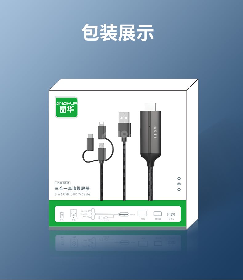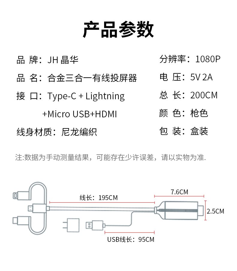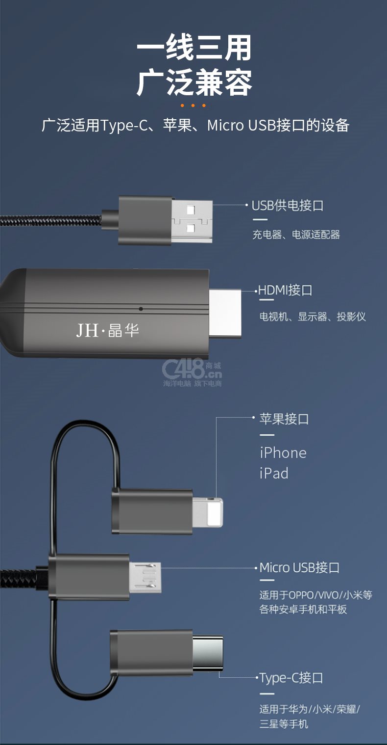“JH(jinghua)/晶華”Z505G 三合一高清投屏器 單個裝(2米同屏線蘋果Lightning安卓Type-C轉(zhuǎn)HDMI高清轉(zhuǎn)換線器手機平板連接電視顯示器)