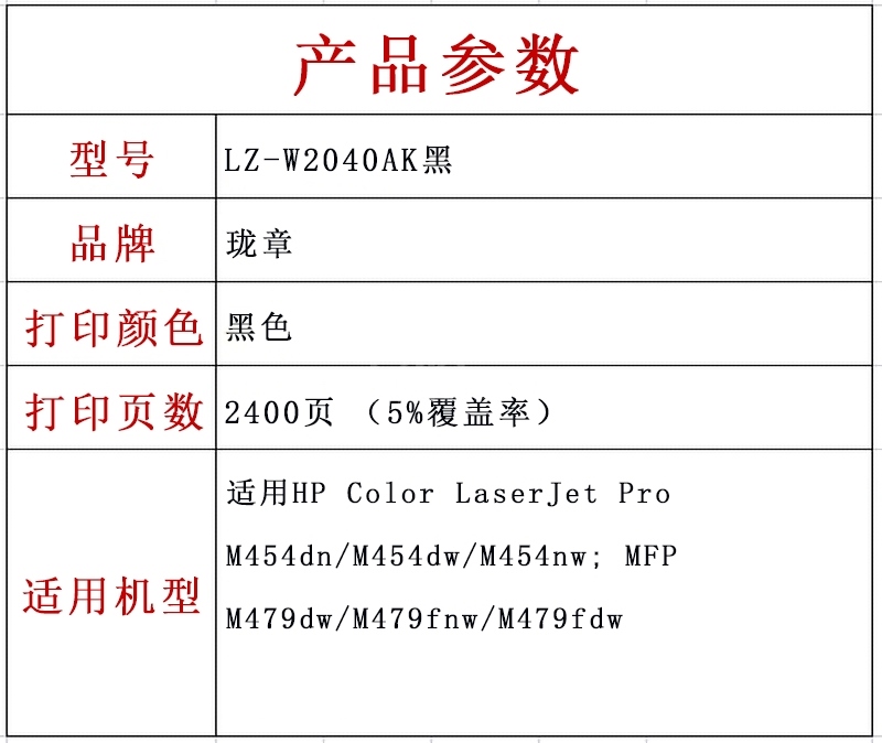 “LZ/瓏章”LZ-W2040AK 激光碳粉盒 單個裝(黑色硒鼓適用HP Color LaserJet Pro M454dn/M454dw/M454nw MFP M479dw/M479fnw/M479fdw)