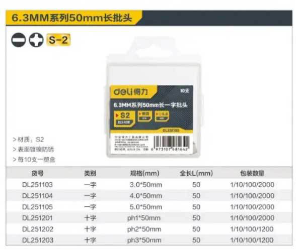 “deli/得力”DL251105 一字批頭 單支裝(6.3MM系列5.0*50mm工具10支/盒)