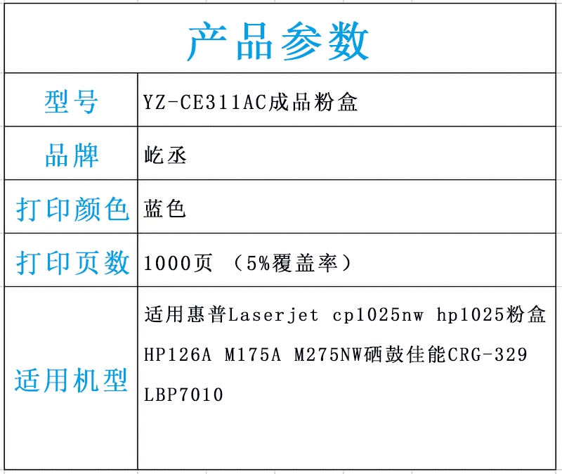“YICHENG/屹丞”YZ-CE311AC 成品粉盒 單個裝(藍(lán)色商務(wù)版CE311A適用惠普Laserjet cp1025nw hp1025 HP126A M175A M275NW硒鼓佳能CRG-329 LBP7010C激光碳粉盒)