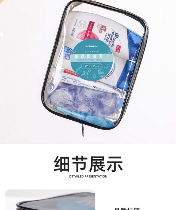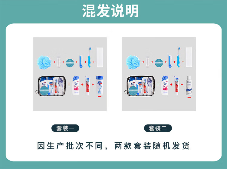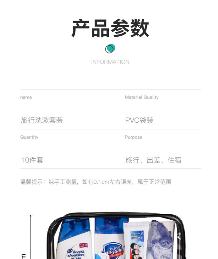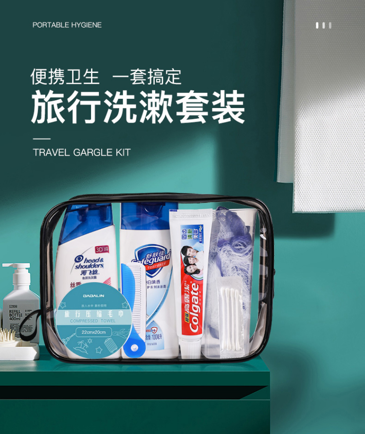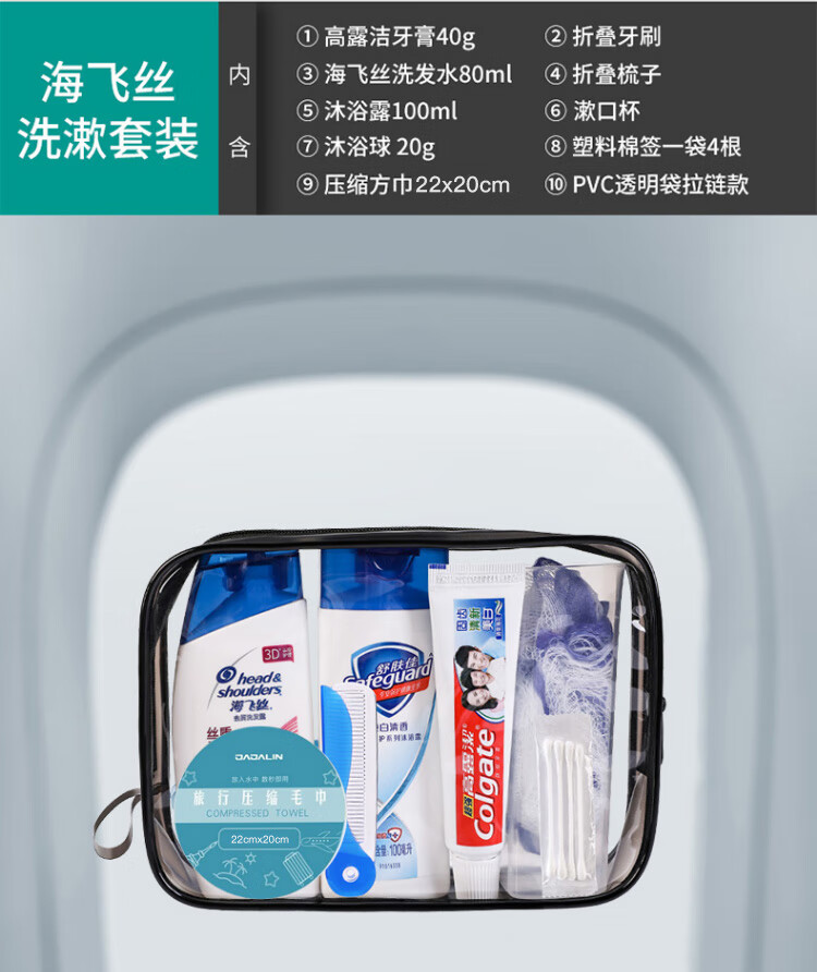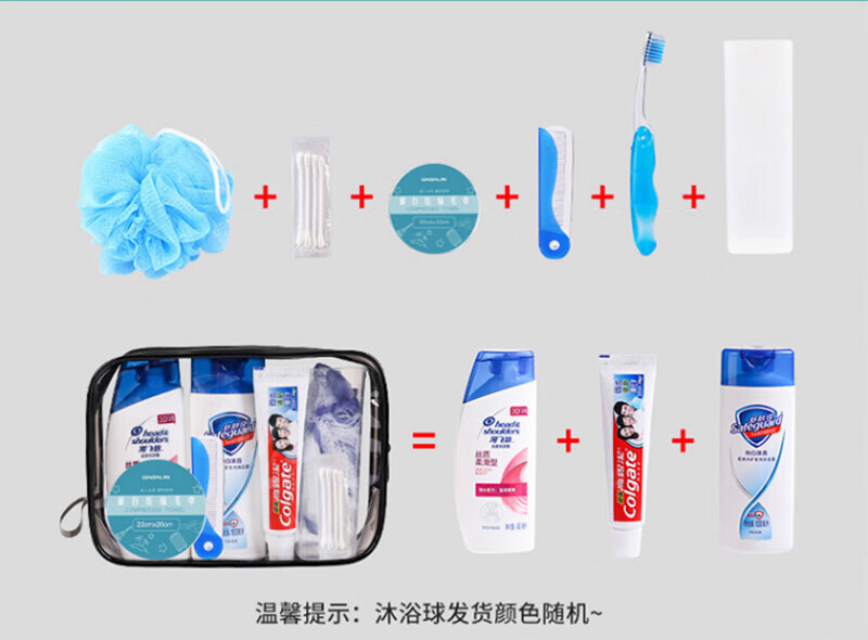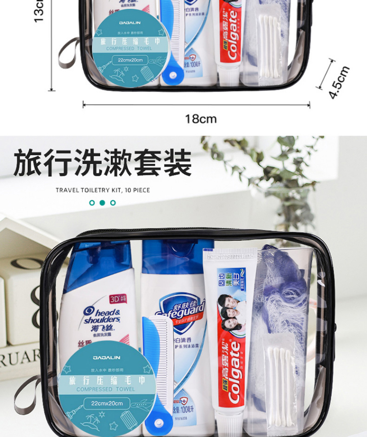 十件套大禮包內(nèi)含:PVC透明袋拉鏈包*1,舒膚佳沐浴露100ml*1,海飛絲洗發(fā)水80ml*1,藍(lán)色蝦米牙刷*1,折疊梳子 藍(lán)柄白齒*1,易旅漱口杯*1,沐浴球 *1,高露潔40g*1,棉簽一袋4根白色兩頭圓*1,一次性壓縮方巾*1