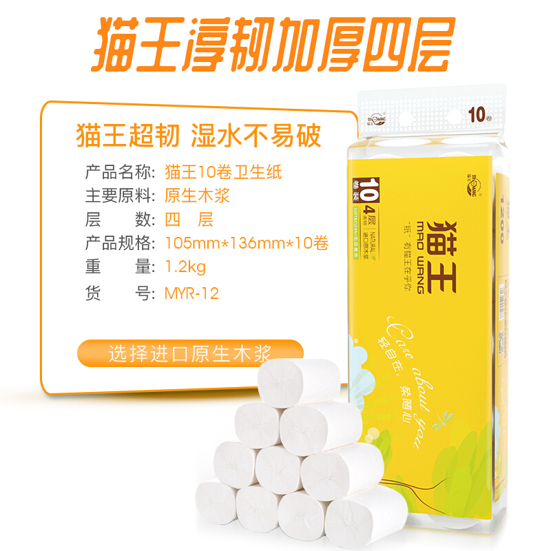 “CAT KING(mao wang)/貓王”MYR-12 衛(wèi)生紙 單提裝(逸柔1200克實心卷紙廁所紙10卷/提)