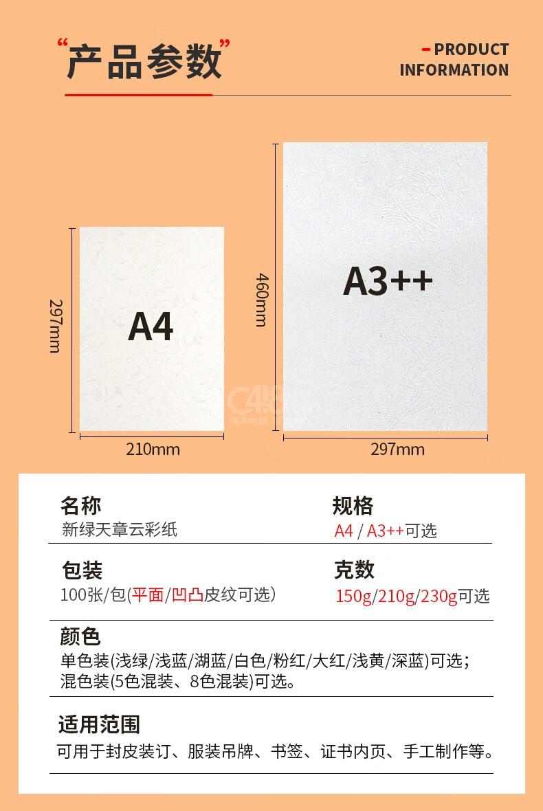 “TANGO/天章”A4 150g 皮紋紙 單包裝(淺藍色平面封面紙云彩紙封皮紙彩色卡紙標書封面硬厚手工卡紙100張/包)