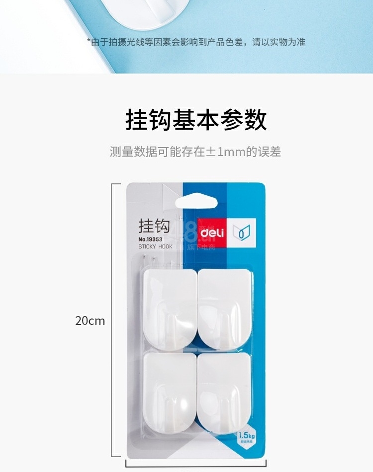 “deli/得力”No.19353 掛鉤 單卡裝(顏色隨機強力無痕粘鉤掛衣鉤免打孔黏鉤4個/卡)