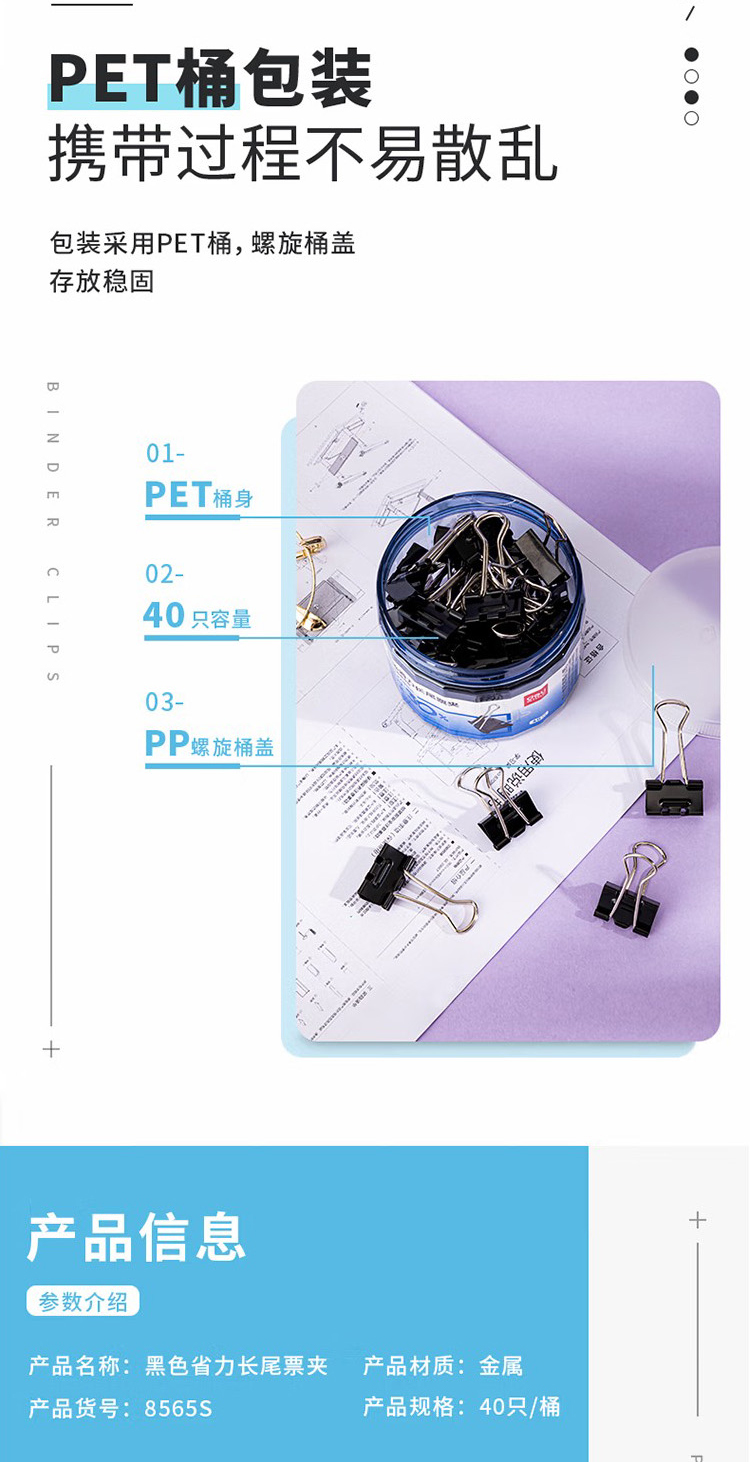 “deli/得力”No.8565S 長尾票夾 1筒裝(黑色省力19mm5號小號長尾夾金屬燕尾夾票據(jù)文件夾子辦公用品40只/筒)