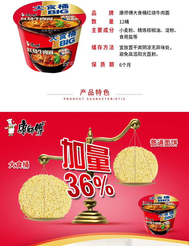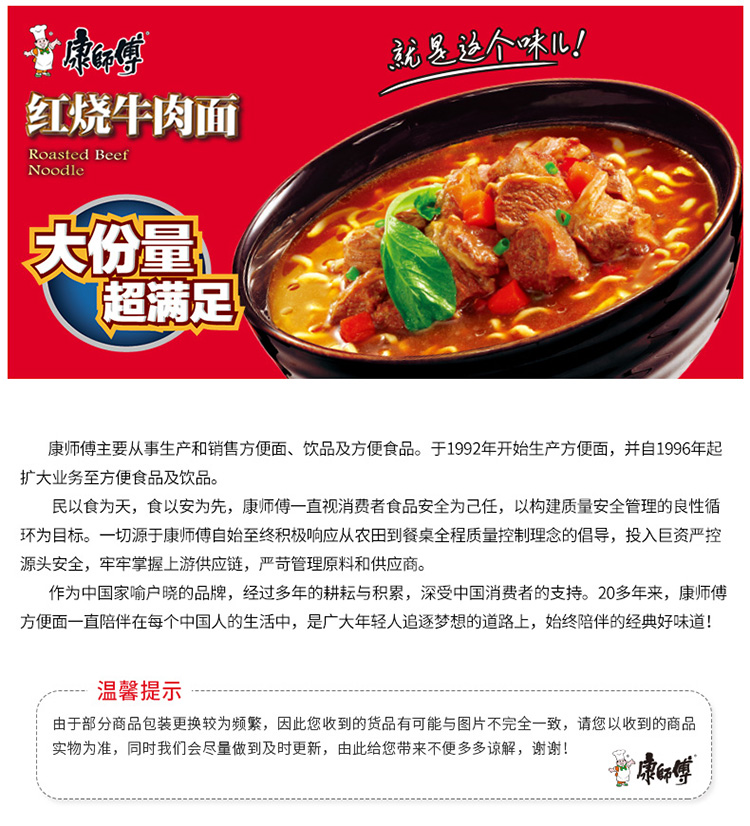 “康師傅”144g*12 紅燒牛肉面 1桶裝(方便面BIG大食桶桶面泡面速食方便食品12桶/箱)
